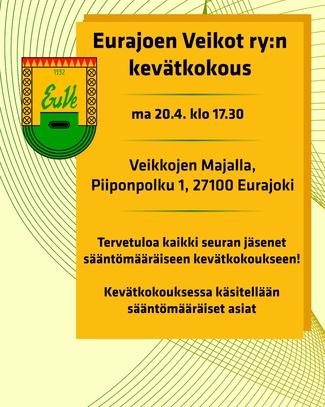 EURAJOEN VEIKOTon vuonna 1932 perustettu urheiluseura Eurajoelta. Seuralla on nykyisin toimintaa monipuolisesti eri liikuntalajien muodossa, esim. pesäpallossa, salibandyssä, yleisurheilussa, hiihdossa ja suunnistuksessa.