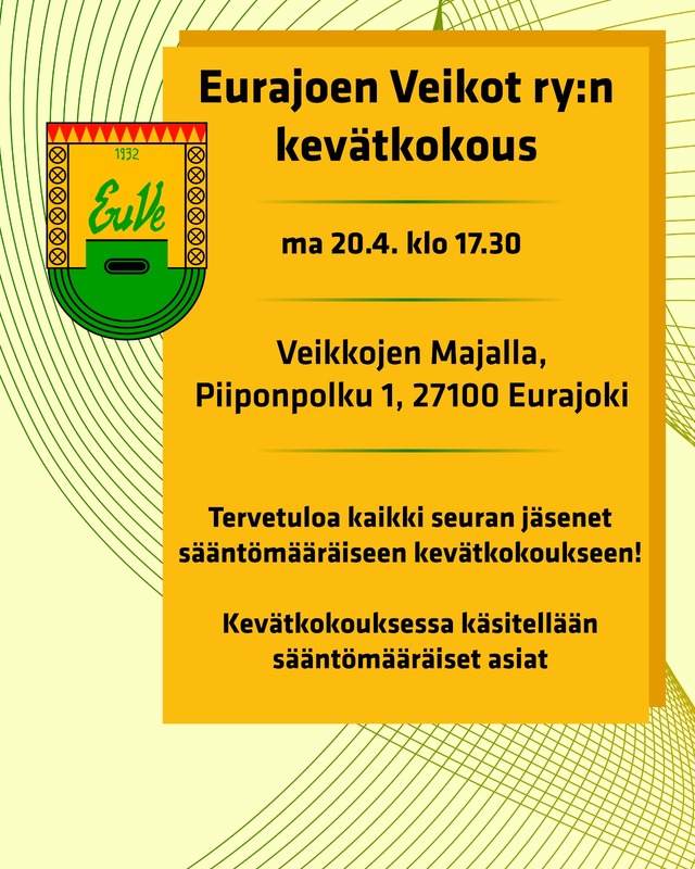 Yhdistyksen sääntömääräinen kevätkokous pidetään Veikkojen Majalla maanantaina 20.4.2026 klo 17.30 alkaen. Käsitellään sääntömääräiset asiat. Kahvitarjoilu.