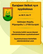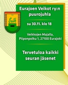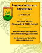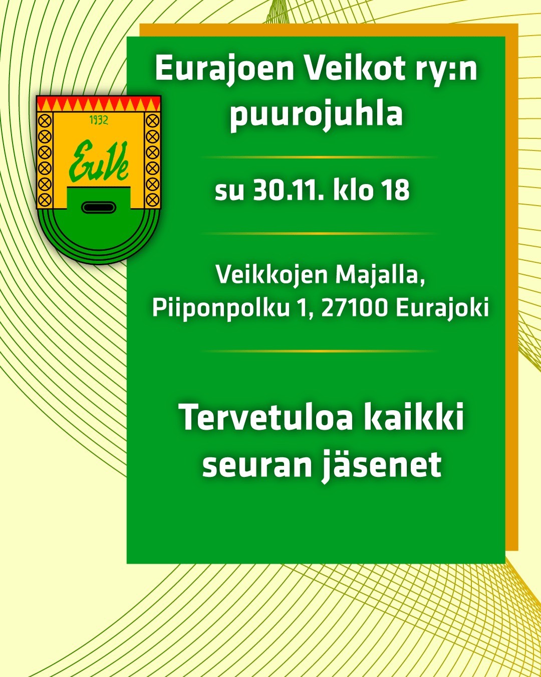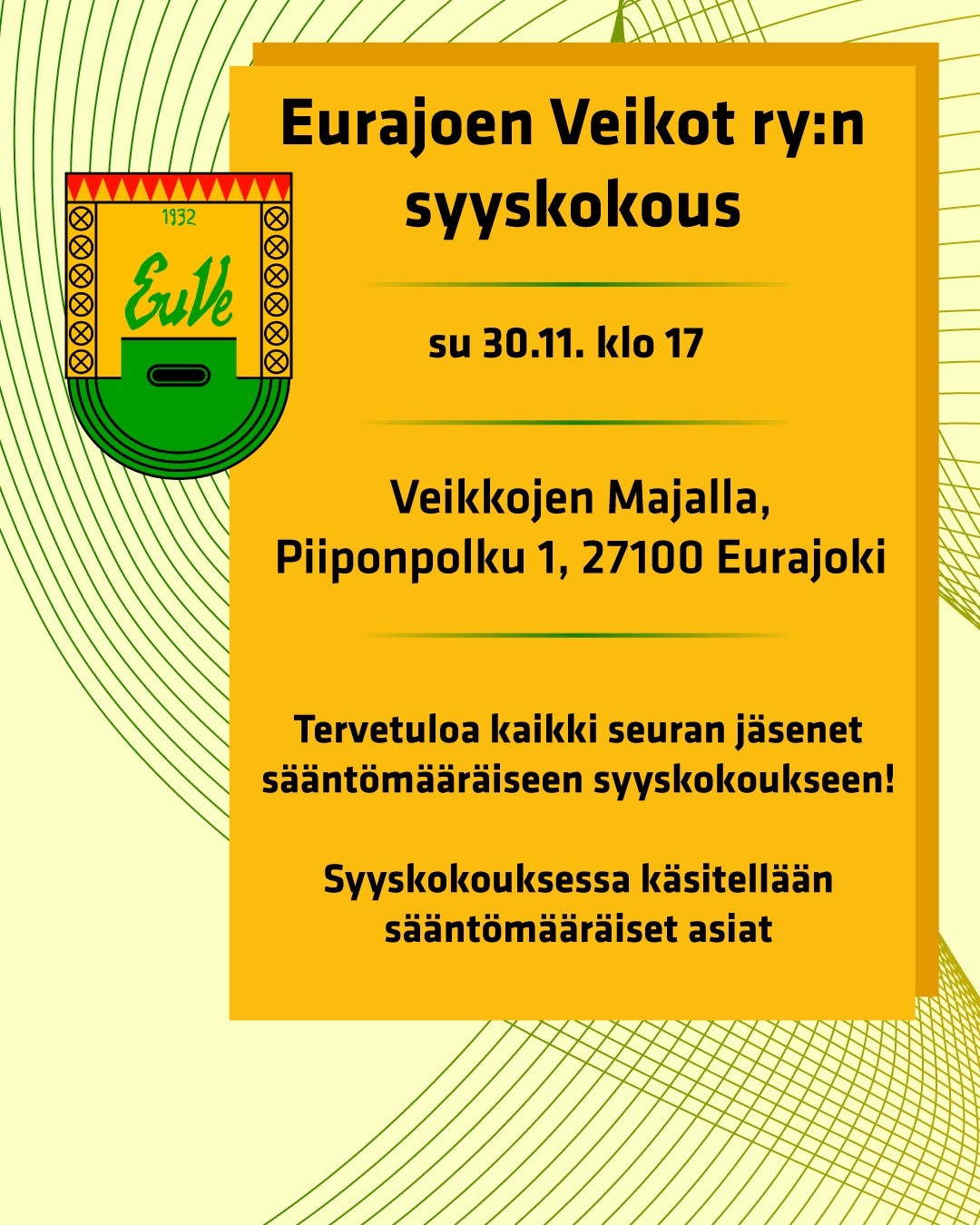 Eurajoen Veikot ry:n syyskokous sunnuntaina 30.11.2025 Eurajoen Veikkojen Majalla (Piiponpolku 1, Eurajoki) klo 17 alkaen.